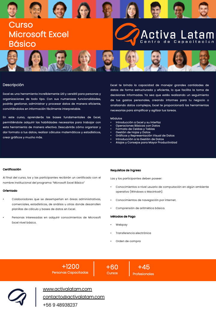 | Excel Básico | Vespertino | Lunes | 2025-11-17 | 18:00 | 22:00 | 4 | Presencial |